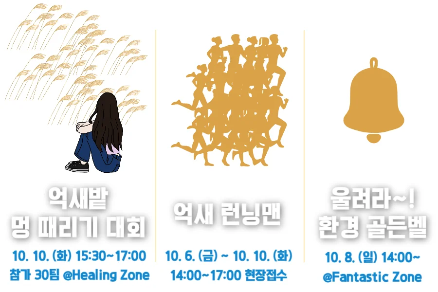주요 행사로는 여러 가지 있지만 제가 보기엔 아래 3가지로 추릴 수 있겠습니다. 먼저 미리 신청해야 하는 두 가지는 억새밭 멍 때리기 대회와 울려라~! 환경 골든벨인데요. 참가 인원이 정해져 있어서 사전에 신청하고 가시면 되겠습니다.