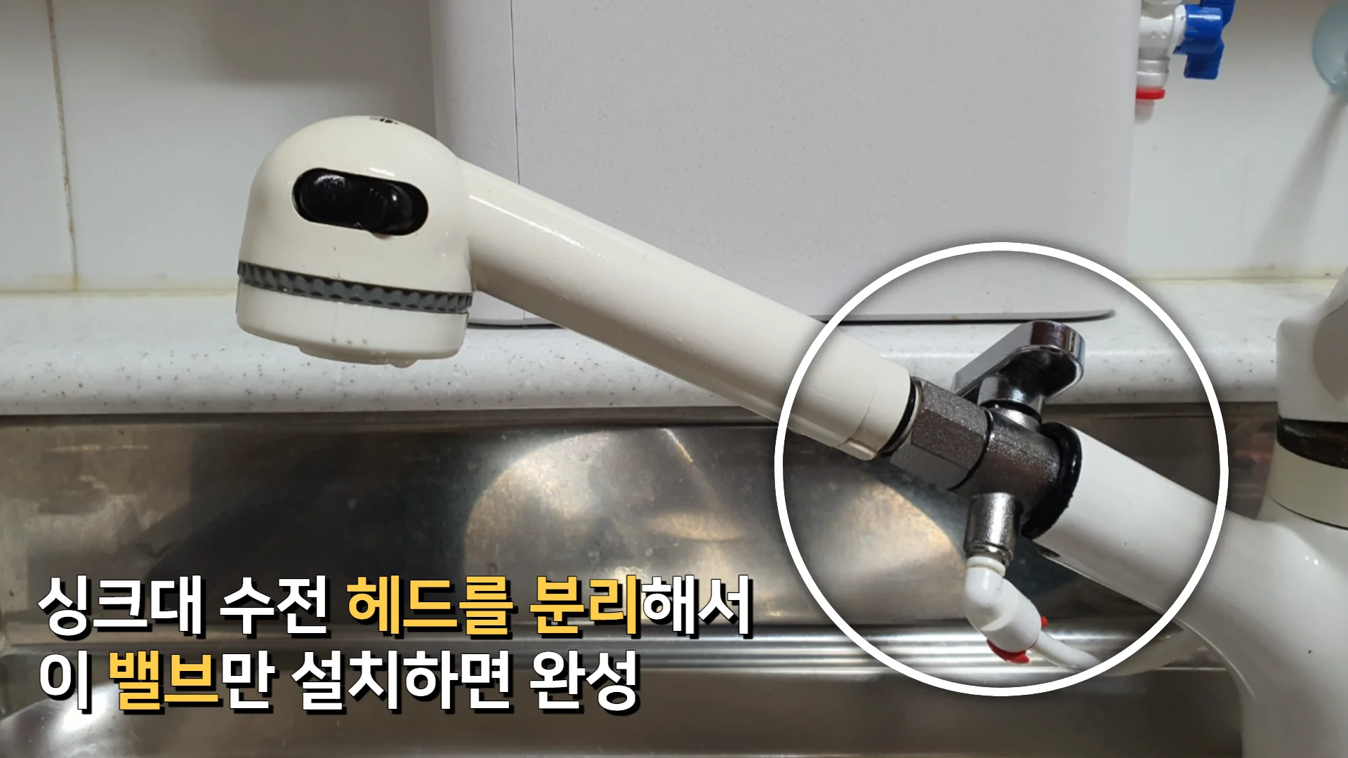 모든 정수기를 설치하기 위해서는 급수라인이 필요한데요, 이 정수기는 간편하게 아래 사진 동그라미 속 밸브를 제공해 주는데 싱크대 수전 헤드를 분리해서 꽂기만 하면 연결이 가능합니다. 이 점이 매우 편리하더라고요. 그리고 우측에 보이면 자칫 급수라인이 지저분해 보일 수 있기 때문에 깔끔하게 마감해 주는 뽁뽁이도 제공이 됐고요.